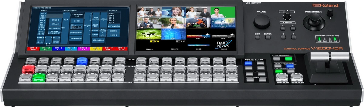 ROLAND V-1200HDR – профессиональная панель управления для мультиформатного видео микшера V-1200HD. Контроллер позволяет с максимальным удобством использовать весь широкий функционал, предоставляемый V-1200HD. Панель управления удобна в использовании, обладает практичным, эргономично организованным пользовательским интерфейсом. V-1200HDR оснащена двумя 7-дюймовыми сенсорными жидкокристаллическими экранами, на которых отображается вся необходимая информация и настройки. Управление и мониторинг осуществлются с помощью этих экранов, также регулировки производятся с использованием большого удобного Т-образного переключателя для управления эффектами и воспроизведением и трех рядов кнопок для работы с источниками сигнала. Возможности коммутации включают видео входы HDMI с поддержкой HDCP, USB, сетевой разъем RJ45, а также стерео 1/4 джек. Панель управления оснащена также встроенным моно динамиком. Габариты V-1200HDR: 52 см х 23,7 см, высота – 11,1 см. Вес модели – 4,3 кг. Сетевой адаптер для подключения электропитания поставляется в комплекте.