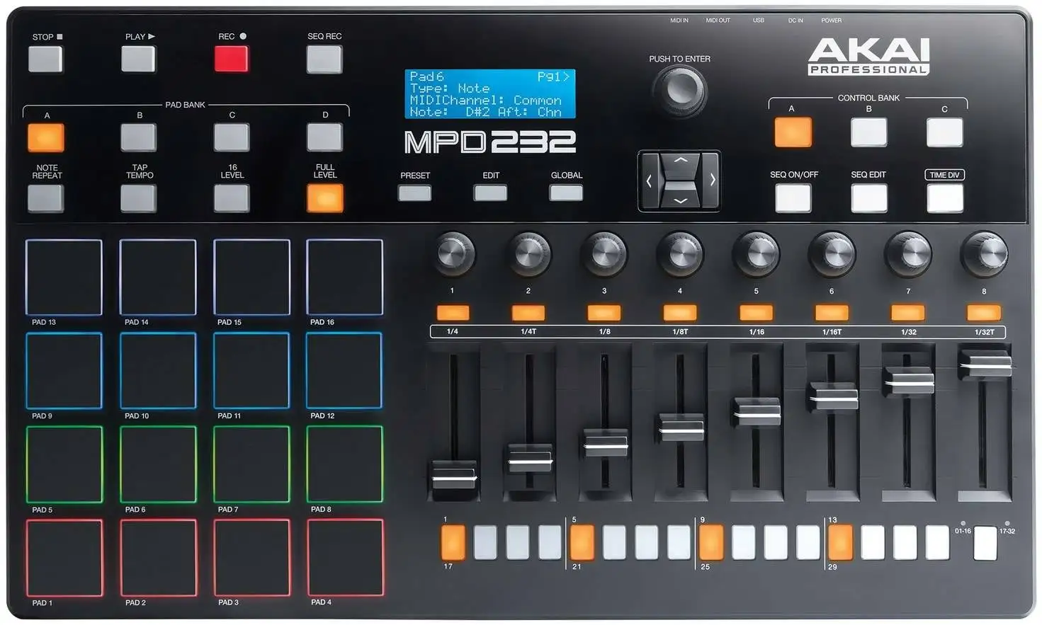 Компания Akai создала чрезвычайно эффективный контроллер с оптимальным набором всех необходимых регуляторов и функций. На борту у прибора 16 удобных пэдов MPC с задней RGB-подсветкой, которая помогает визуализировать рабочий процесс. Пэды наделены теми же функциями, что и в других контроллерах Akai, например Note Repeat и Full Level. Панель управления включает в себя 8 фейдеров, каждый из которых снабжен одной кнопкой D-Link и одним энкодером D-Link и вы сможете назначить каждую кнопку на любую функцию.