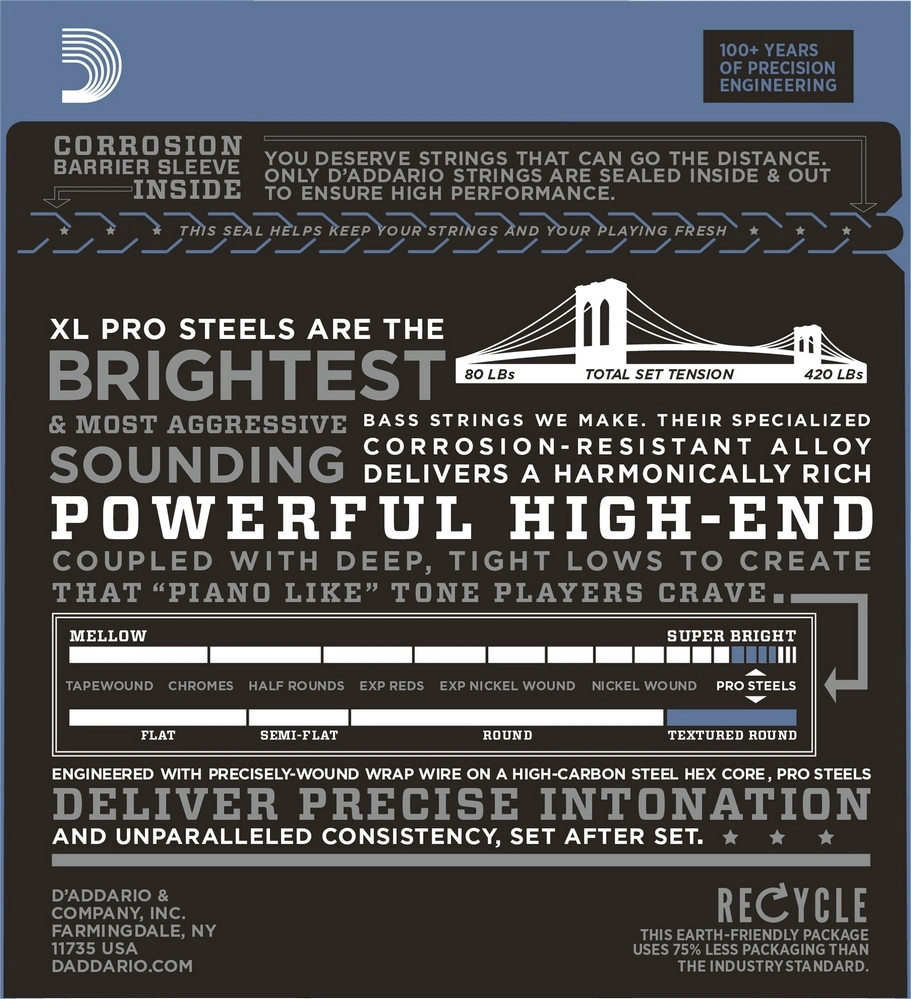 Струны серии ProSteels обладают самым ярким звучанием и лучшими магнитными свойствами среди струн D'Addario. Применение специального сплава обеспечивает бриллиантово-чистое звучание на высоких тонах, богатое гармоническими составляющими в сочетании с глубокими и плотными низами, вместе создающими «фортепианное звучание», желанное для многих исполнителей. Струны ProSteels хороши как для артикулированной пальцевой игры, так и для агрессивного щипкового стиля. Калибр струн: (струны с обмоткой) .040, .060, .075, .095,.125. Упаковка струн не загрязняет окружающую среду. Она обеспечивает хорошую защиту от коррозии и сохранность струн. Струны произведены в США.