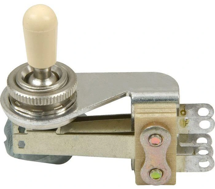 DIMARZIO SWITCHCRAFT TOGGLE SWITCH RIGHT ANGLE EP1100 - это угловой 3-позиционный переключатель звукоснимателей тумблерного типа. Такой переключатель как правило устанавливают на панель гитары. Тумблер может быть использован с любым типом звукоснимателей, как синглов, так и хамбакеров. Его можно устанавливать на электрогитары активной и пассивной электроникой. В комплекте поставки опционально находится руководство для установки на инструмент, рекомендованные производителем схемы, крепежные элементы, аксессуары и пр.