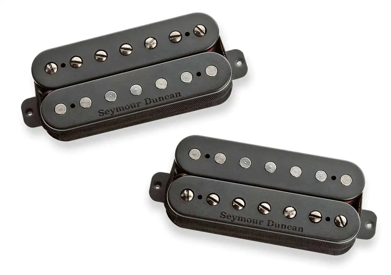 SEYMOUR DUNCAN Set, 7 Str, Pegasus/Sentient Blk - это комплект пассивных звукоснимателей для семиструнной электрогитары. Тип звукоснимателя - хамбакер. Цвет корпуса черный. Для тонкой подстройки есть семь регулируемых винтов-сердечников. Выходной уровень: neck - средний, bridge - высокий. Тип магнита- Alnico 5. Позиция установки - Bridge, Neck. Коммутация - четыре провода.