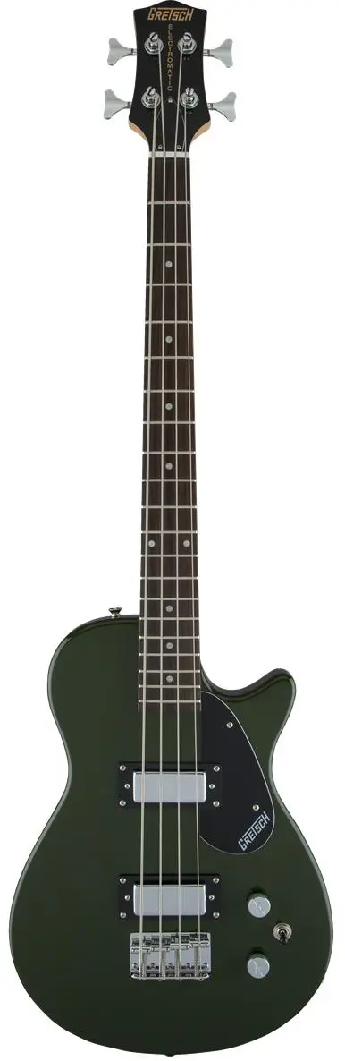 GRETSCH G2220B Electromatic® Junior Jet II – четырехструнная бас-гитара в классическом стиле Gretsch из линейки Electromatic®, выдающая мощный, насыщенный низкий звук. Характерная особенность инструмента – укороченная мензура 30,3 дюйма. Корпус модели выполнен из липы с глянцевым покрытием. Гриф – кленовый, также с глянцевой отделкой. Модель оснащена накладкой из ореха радиуса 12 дюймов, на грифе 20 ладов Medium Jumbo, инкрустированных перламутровыми точками. За звук отвечают два мини-хамбакера собственной разработки Gretsch. Переключатель – трехпозиционный. Для настройки звука используются регуляторы громкости и тембра. Бас-гитара выпускается в двух вариантах цветового исполнения. Представленная модель – стильного темно-зеленого цвета («Torino Green») с хромированной фурнитурой и контрастным черным пикгардом с белым логотипом Gretsch.