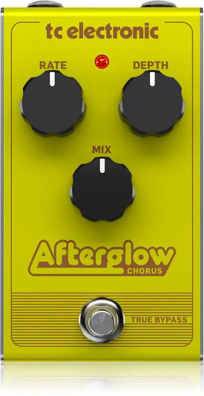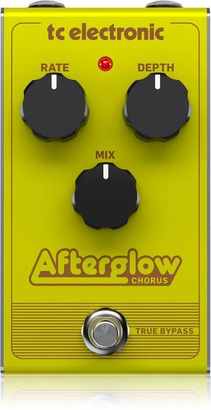 TC ELECTRONIC AFTERGLOW CHORUS – гитарная педаль, эффект хорус, модель в винтажном стиле с легендарной полностью аналоговой электронной схемой BBD (Bucket Brigade Delay). Создатели этой педали ориентировались на тембры модуляции, характерные для золотой эпохи рок-н-ролла. С помощью AFTERGLOW CHORUS можно получить разнообразие звуков, отправившись в настоящее путешествие во времени: от динамика Лесли, характерного для 60-х и 70-х до гранжа. Звучание, получаемое при использовании педали AFTERGLOW CHORUS, – богатое и насыщенное, обладающее объемом, оставляющим ощущение настоящей трехмерности. Управление осуществляется с помощью трех регуляторов: Rate (настраивает скорость модуляции), Depth (настраивает интенсивность эффекта) и Mix (регулирует соотношение исходного сигнала и обработанного). Режим True Bypass гарантирует, что эффект не влияет на звук инструмента, когда не используется. Педаль заключена в прочный цельнометаллический корпус «Built-like-a-tank» яркого желтого цвета, способный выдержать не самое бережное обращение в турах. Электропитание – от батарейки «Крона» 9 вольт или сетевого адаптера TC Electronic Powerplug 9 (приобретается отдельно).