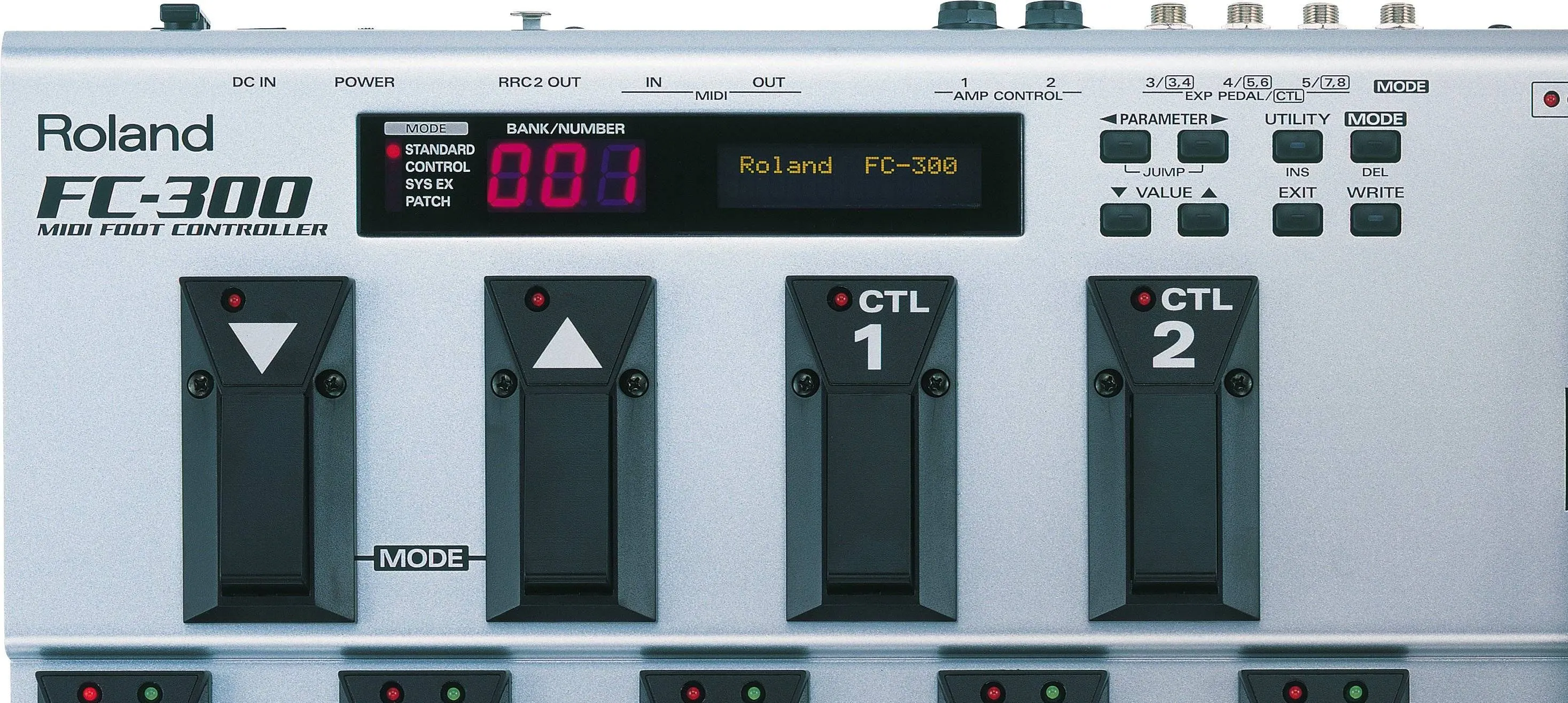 ROLAND FC-300 является напольным MIDI контроллером, несомненно, установившим новый стандарт мощных возможностей и универсальности в напольном педальном управлении устройствами MIDI. Наличие функций, осуществляющих вызов патчей из внутренней памяти, двунаправленную передачу данных на ROLAND VG-99 при помощи недавно принятого протокола RRС2 (только для продукции бренда Roland), позволяющего осуществлять данный тип передачи данных и подачу электропитания при помощи кабеля Lan (СAT5), а также наличие девяти педалей для управления и педали экспрессии, делает модель ROLAND FC-300 превосходно подходящей для совместной работы с гитарной системой VG-99. Разумеется, данный контроллер может использоваться и для работы с другими MIDI-устройствами или инструментами.