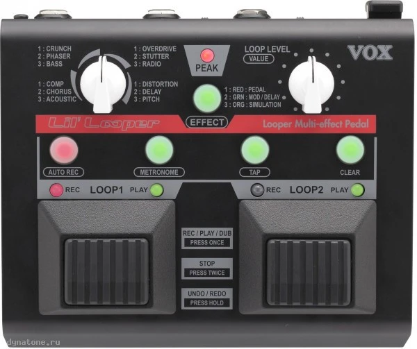 Комбинируя две независимые петли с дюжиной встроенных эффектов, VOX Lil’ Looper содержит в себе самые выигрышные характеристики и особенности VOX Dynamic Looper. Отличительные черты этого лупера – простота в использовании, прочные ножные переключатели, универсальные эффекты и наложение петель. Все это идеально подойдет тем гитаристам, которые хотят привнести нечто новое в свои выступления или ищут свой исполнительский стиль. И это еще не все преимущества Lil\" Looper! Он легкий, компактный и питается от батареек. Прибор также снабжен балансным микрофонным входом, линейным выходом и выходом на наушники.