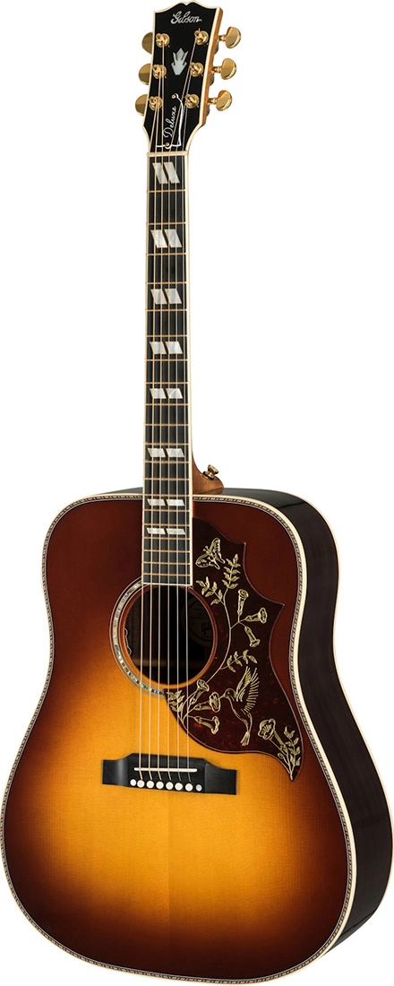 GIBSON 2019 Hummingbird Deluxe Rosewood Burst – модель 2019 года, электроакустическая гитара в корпусе дредноут, настоящий, безошибочно узнаваемый Hummingbird с красивой нижней декой и обечайками из палисандра. Эта великолепная гитара обладает полнотелым, округлым звучанием, характерным для традиционных моделей Hummingbird, с добавлением уникальных тембральных ноток, которые даёт палисандр. Верхняя дека – из ситхинской ели. Гриф выполнен из красного дерева, мензура – 24,75”. Накладка – ричлайт. На грифе 20 ладов с инкрустацией рассеченными параллелограммами. Колки – золотые Grover Rotomatic. Прекрасное звучание инструмента сочетается с его внешней красотой. Модель представлена в классическом цвете санбёрст с пикгардом изящной формы Hummingbird Avant Garde с золотым тиснением. Гитара идеальна для сцены, она оснащена высококачественной электроникой LR Baggs ™ VTC с удобно расположенными в резонаторном отверстии регуляторами громкости и тембра. В комплекте с инструментом поставляется фирменный жесткий кейс.