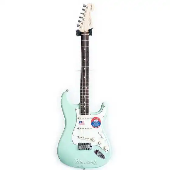 FENDER Jeff Beck Stratocaster, Rosewood Fingerboard, Surf Green - подписная модель знаменитого британского гитариста-виртуоза Джеффа Бека, начинавшего свою карьеру в The Yardbirds. Это одна из самых популярных моделей Стратокастера, выпускаемых Fender. Jeff Beck Signature Stratocaster имеет элегантный классический внешний вид и безошибочно узнаваемый фендеровский звук, ставший визитной карточкой Джеффа Бека и прославивший эту модель гитары. Корпус гитары выполнен из ольхи с уретановой отделкой. Гриф - кленовый, профиля "C", с матовой уретановой отделкой. Накладка - палисандровая, инкрустирована перламутровыми точками. На грифе 22 лада Medium Jumbo. Звукосниматели - три сингла Dual-Coil Ceramic Noiseless™, которые позволяют добиться полного отсутствия гула, гудения и других посторонних шумов и помех. Переключатель - пятипозиционный. Настройка звучания осуществляется тремя регуляторами: двумя регуляторами тембра и регулятором громкости. Бридж - тремоло 2-Point American Series Synchronized. Представленная модель - элегантного цвета морской волны с контрастным трёхслойным пергаментным пикгардом. Пластиковые элементы – состаренного белого цвета. В комплекте с инструментом поставляется фирменный жесткий кейс, ремень и кабель.