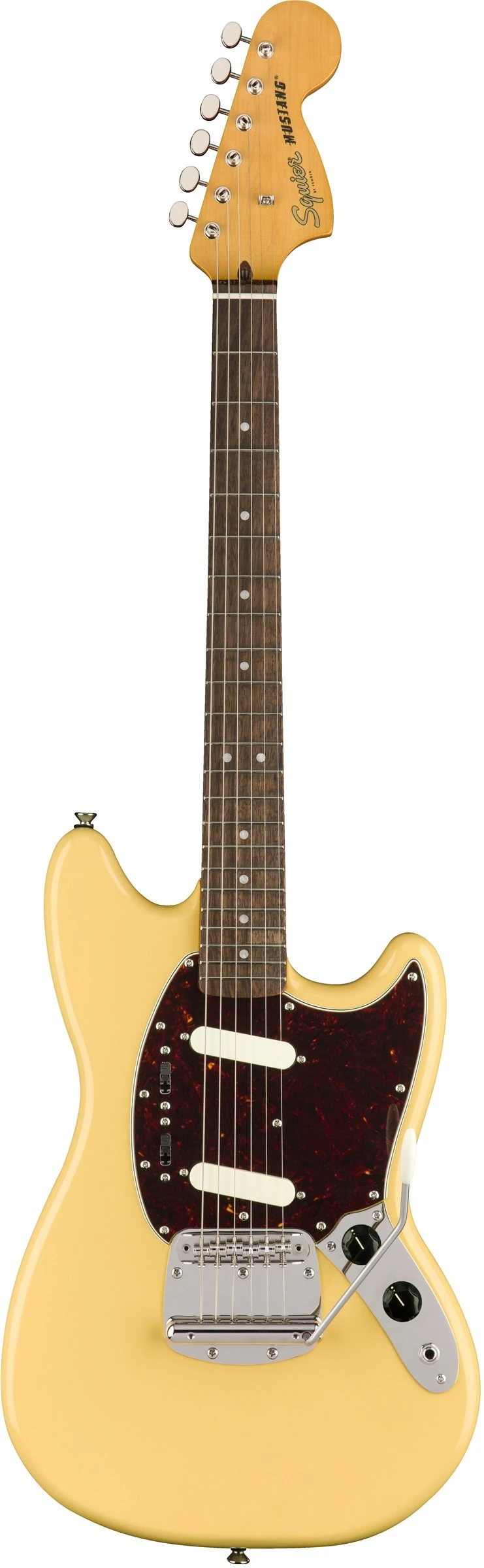 FENDER SQUIER Classic Vibe 60s MUSTANG LRL VWT – воссоздание чрезвычайно популярной модели шестидесятых годов из линейки Squier Classic Vibe. Эта компактная гитара в обтекаемом корпусе Mustang® узнаваемой асимметричной формы обладает мощным звучанием, достигаемым благодаря двум синглам с магнитами Alnico собственной разработки Fender. Ретро-дизайн модели дополняют надписи на голове грифа в стиле шестидесятых, дорого выглядящая никелированная фурнитура, тонированное глянцевое уретановое покрытие грифа, колки в винтажном стиле. Корпус гитары выполнен из тополя. Тонкий кленовый гриф профиля «С» оснащен удобной накладкой радиуса 9,5 дюймов из терминалии. Музыканты с небольшим размером руки оценят по достоинству удобство укороченной 24-дюймовой мензуры. На грифе 22 лада Narrow Tall с инкрустацией белыми точками. Регуляторы: громкость и тембр. Бридж - плавающее тремоло Vintage-Style. Представленная модель – элегантного желтоватого цвета «Vintage White» с глянцевым полиуретановым покрытием, четырехслойным черепаховым пикгардом.
