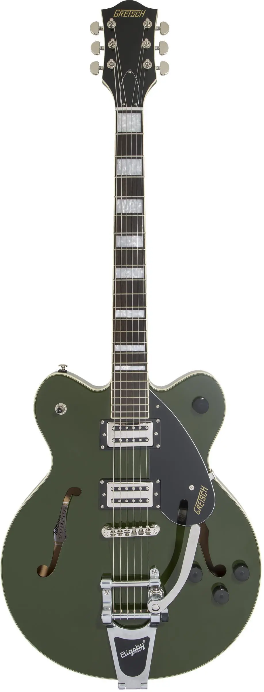 GRETSCH G2622T STRML CB DC TOR – современная полуакустическая электрогитара, специально созданная для гитаристов, которые всегда стремятся к большему: большей производительности и в первую очередь большей громкости. Модель выполнена из высококачественных материалов и комплектующих, она элегантно выглядит, оснащена улучшенной электроникой и выдаёт великолепный узнаваемый звук Gretsch. Особенности представленной модели Streamliner Center Block – это новейшие хамбакеры Broad'Tron™ BT-2S собственной разработки инженеров Gretsch, сконструированные специально для этой гитары, и центральное ребро из лёгкой сосны, укрепляющее верхнюю деку гитары и позволяющее избежать нежелательной обратной связи при игре на высокой громкости. Broad'Tron - это звукосниматель с высоким выходным уровнем, выдающий уникальный звук благодаря сочетанию мощных густых низов, чистых и прозрачных верхних частот, хрипловатой середины. Переключатель – 3-позиционный. В дополнение к регуляторам тембра и общего уровня громкости предусмотрены отдельные регуляторы громкости для каждого из звукоснимателей. Корпус гитары формы Streamliner Center Block с двумя вырезами выполнен из ламинированного клена. Гриф удобного для быстрой игры профиля Thin "U" – из древесины нато, с глянцевой отделкой и состаренной белой окантовкой. Мензура – 629 мм (24.75 дюйма). Накладка – палисандровая, радиус – 12 дюймов (305 мм). На грифе 22 лада Medium Jumbo. Порожек выполнен из искусственной кости. Бридж Adjusto-matic™ обеспечивает стабильность строя, а тремоло Bigsby B70 даёт широкие возможности для экспрессивной игры. Инструмент элегантно выглядит в изящном полом корпусе с винтажными черными регуляторами, состаренной белой окантовкой корпуса, обтекаемой никелированной фурнитурой и трехслойным черным пикгардом с логотипом Gretsch. Модель представлена в цвете «Torino Green».