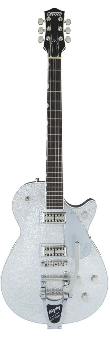 GRETSCH G6129T PRO PE JET SLV - это шестиструнная электрогитара линейки PRO. Инструмент под правую руку. Эта электрогитара имеет оригинальное, узнаваемое звучание инструментов Gretsch, которое нельзя спутать с другими марками гитар. Также гитара отличительна оригинальным стилем деки и головы грифа. Инструмент оборудован грифом из махагони с накладкой из черного дерева. Мензура гитары составляет 24,6" (625 мм), цвет гитары серебристый.