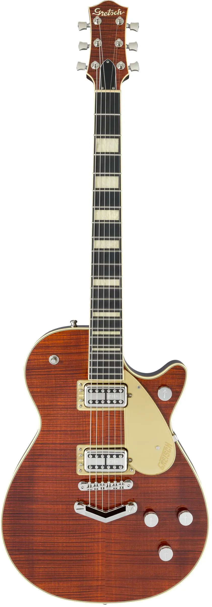 GRETSCH G6228FM PRO PE JET BT BBN - это шестиструнная электрогитара линейки PLAYERS EDITION JET. Инструмент под правую руку. Эта электрогитара имеет оригинальное, узнаваемое звучание инструментов Gretsch, которое нельзя спутать с другими марками гитар. Также гитара отличительна оригинальным стилем деки и головы грифа. Инструмент оборудован грифом из махагони с накладкой из палисандра. Мензура гитары составляет 24,6" (625 мм), цвет гитары красный матовый.