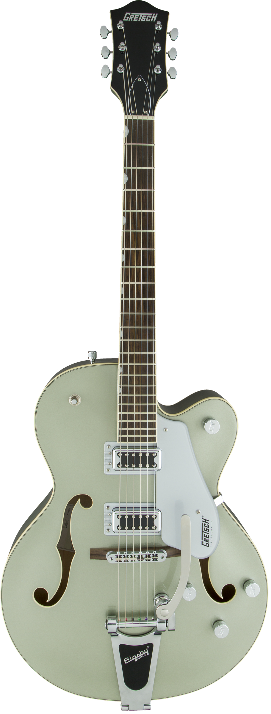 Gretsch G5420T Electromatic® Hollow Body Single-Cut - электрогитара с полым корпусом из линейки Electromatic®. Это классическая модель Gretch с узнаваемым звуком и традиционным дизайном. Звучание инструмента – мощное, динамичное, очень четкое, с великолепной артикуляцией. Гитара заключена в корпус формы Electromatic® с одним вырезом, выполненный из пяти слоев кленовой древесины. Конструкция корпуса и отверстия формы «f» в верхней деке обеспечивают прекрасный резонанс. Гриф – кленовый, с глянцевой отделкой. Мензура – 648 мм (25.5 дюйма). Накладка – палисандровая, радиус – 12 дюймов (305 мм). На грифе 22 лада Medium Jumbo с оригинальной перламутровой инкрустацией Neo-Classic™ Thumbnail по краю. Порожек - Graph Tech® TUSQ XL. Голова грифа выполнена в стиле гитар Gretch G6120 конца 50-х годов. Звукосниматели – два хамбакера собственной разработки Blacktop™ Filter'Tron™. Переключатель – 3-позиционный. В дополнение к регуляторам тембра и общего уровня громкости предусмотрены отдельные регуляторы громкости для каждого из звукоснимателей. Палисандровый бридж Adjusto-matic™ обеспечивает надежность строя, а тремоло Bigsby® B60 даёт широкие возможности для экспрессивной игры. Модель представлена в элегантном серо-зеленом перламутровом цвете с регуляторами формы G-Arrow и серебристым пикгардом с черным логотипом Gretch. На инструменте установлены никелированные струны толщиной .011 - .049.