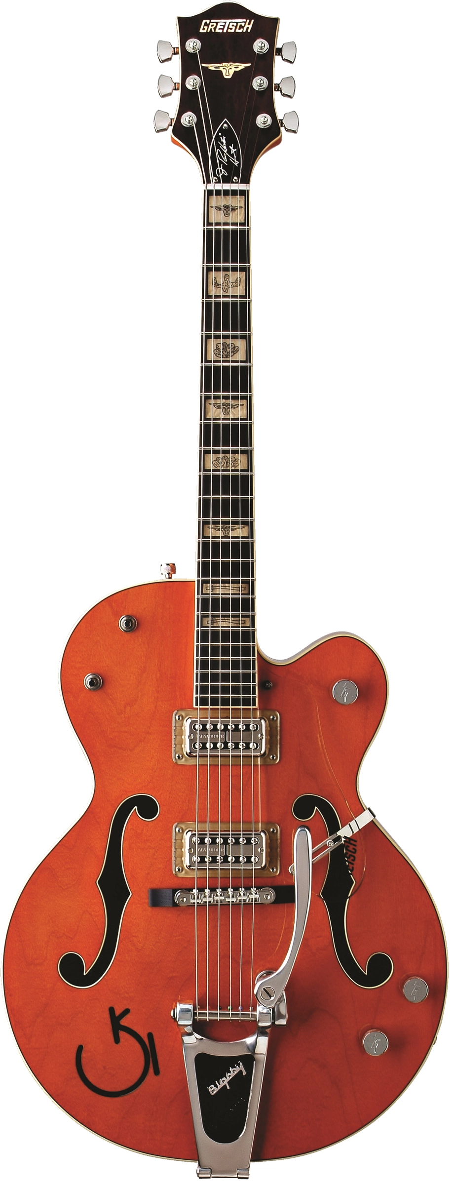 Дека формы Nashville®/G6120 с одним вырезом и увеличенными резонаторными отверстиями формы «f» сделана из ламинированного клёна. Глубина корпуса – 70 миллиметров. Гриф – из клёна, с глянцевой лакированной нитроцеллюлозной отделкой. Накладка – из черного дерева. На грифе 22 лада, инкрустированных прямоугольниками с разнообразным орнаментом. Порожек – синтетическая кость. Звукосниматели – TV Jones® Classic. Переключатель – трёхпозиционный. Для настройки звука используются три регулятора громкости: отдельные для каждого звукоснимателя и общий. Колки - литые самозапирающиеся Gotoh®. Бридж – Adjusto-Matic™ с тремоло Bigsby®. Гитара окрашена в элегантный оранжевый цвет с лакированным покрытием. В комплекте фирменный жесткий кейс черного цвета.