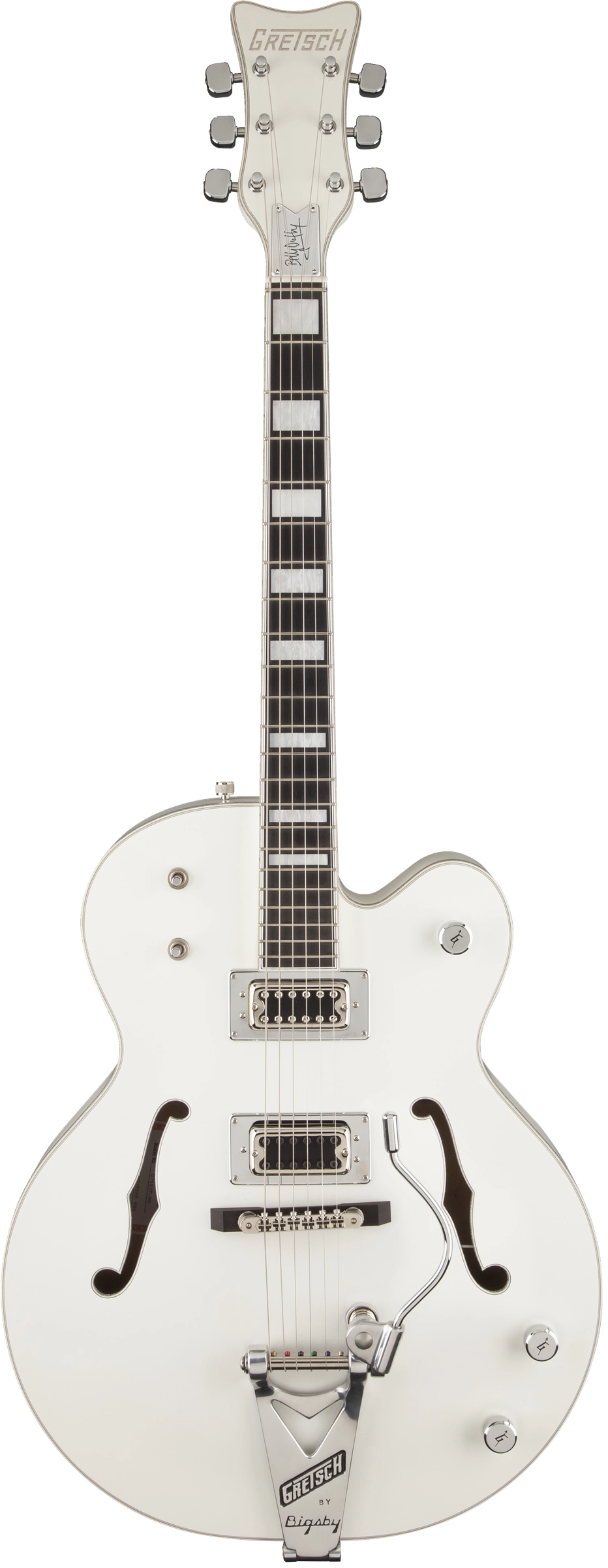 Дека гитары формы Falcon™ с одним вырезом выполнена из ламинированного клёна. Глубина корпуса – 70 мм. Конструкция корпуса и отверстия формы «f» в верхней деке обеспечивают густой, насыщенный звук с прекрасным резонансом. Гриф – сделан из сочетания дерева клёна и ореха, из трёх кусков, с глянцевой нитроцеллюлозной отделкой. Мензура – 648 мм (25.5’’). Накладка – из черного дерева, радиус – 12’’ (305 мм). На грифе 22 лада плюс нулевой, лады инкрустированы крупными перламутровыми прямоугольниками. Звукосниматели - Custom Wound Blacktop™ Filter'Tron™ с трёхпозиционным переключателем. Звук настраивается традиционным для гитар Gretsch образом, тремя регуляторами громкости: для каждого звукоснимателя и общим. На инструменте установлено тремоло Bigsby, любимая модель Даффи. Гитара представлена в элегантном белом цвете с лакированным покрытием и головой грифа формы Falcon™ в цвет корпуса. На крышке анкера размещена подпись Билли Даффи. На гитаре стоят никелированные струны толщиной .010 - .046. В комплекте - фирменный жесткий кейс, модель Билли Даффи, пятнистый, серого цвета.