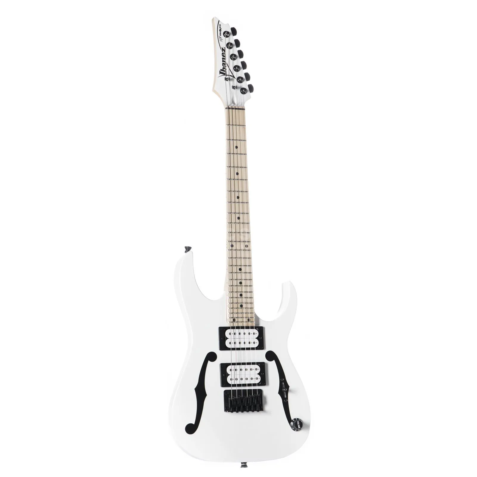 IBANEZ PGMM31-WH Paul Gilbert Signature miKro – шестиструнная электрогитара из линейки PGM, подписная модель знаменитого гитариста-виртуоза Пола Гилберта (Mr. Big). Модель представлена Ibanez в 2017 году. Этот стильный инструмент компактного форм-фактора MiKro имеет укороченную мензуру - 22,2’’ (564 мм). Такая модель отлично подойдёт и начинающим гитаристам, и профессионалом с большим опытом. На этой электрогитаре очень удобно играть, если у Вас небольшая рука, она будет прекрасным выбором для девушек или подростков. PGMM31 – недорогая модель с прекрасным звуком, имеющая необычный стильный внешний вид. В её конструкции используются высококачественные материалы и комплектующие. Корпус гитары выполнен из тополя. Гриф – профиля PGMM, кленовый, с накладкой также из клёна. Радиус накладки – 400 миллиметров. Гриф инкрустирован черными точками. На гитаре установлены 2 открытых пассивных хамбакера Infinity R с керамическими магнитами. Элементы управления включают один регулятор громкости и 3-позиционный переключатель звукоснимателей. Бридж PGMM31-WH – фиксированный. Представленная гитара отличается оригинальным дизайном. Инструмент окрашен в элегантный белый цвет с головой грифа в цвет корпуса, с черной фурнитурой и контрастными графическими изображениями черного цвета на деке, имитирующими отверстия формы «f», характерные для гитар с полым корпусом.