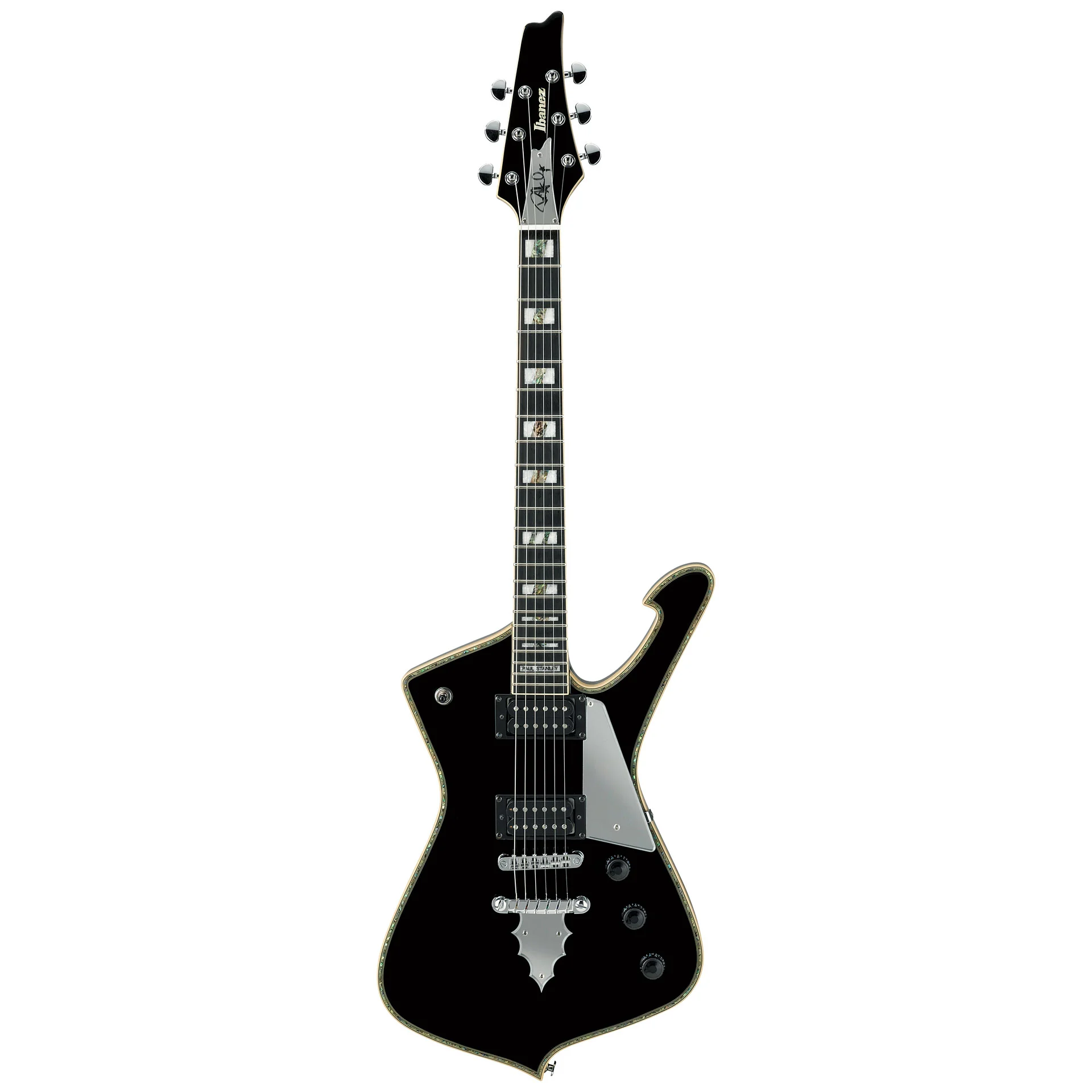 IBANEZ PS120-BK - это 6-струнная электрогитара, подписная модель гитариста Paul Stanley. Электрогитара имеет яркое звучание, оригинальный стиль деки и головы грифа. Гитара оборудована 3-составным грифом (PS 3-piece) из красного дерева (махагони), гриф вклеен в деку. Накладка грифа из черного дерева с маркерами ладов в виде прямоугольников. Дека гитары изготавливается из махагони с топом из клена. Этот инструмент пользуется популярностью среди гитаристов играющих рок-музыку.