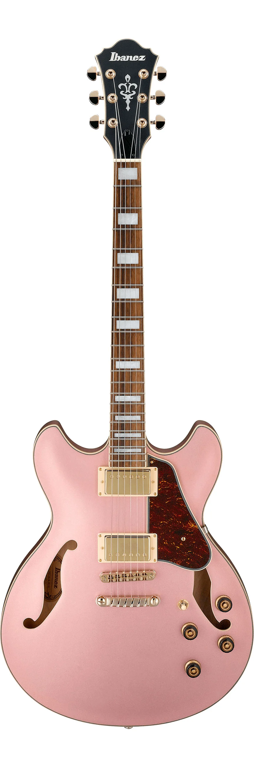 IBANEZ AS73G-RGF - электрогитара с полым корпусом, инструмент модельного ряда 2020 года из линейки Artcore. Эта серия была впервые представлена в 2002 году и завоевавшей популярность благодаря качеству материалов и сборки в сочетании со сравнительно демократичной ценой. Корпус гитары полностью выполнен из липы. Гриф – вклеенный, из ньятона. Мензура – 628 миллиметров (24,7’’). Накладка – из ореха с инкрустацией акриловыми прямоугольниками. Радиус накладки – 305 мм. На грифе 22 лада Medium. Бридж Gibraltar Performer со струнодержателем Quik Change III позволяет оптимально передать вибрацию струн и обеспечивает стабильность строя. Звукосниматели – два пассивных хамбакера Classic Elite с керамическими магнитами – позволяют получить густой, плотный звук с усиленными низкими частотами. Переключатель звукоснимателей - трехпозиционный. Для настройки звука предусмотрены два регулятора громкости и два регулятора тембра. Гитара представлена в элегантном цвете светло-розовый металлик с черной головой грифа, черепаховым пикгардом и золотой фурнитурой.