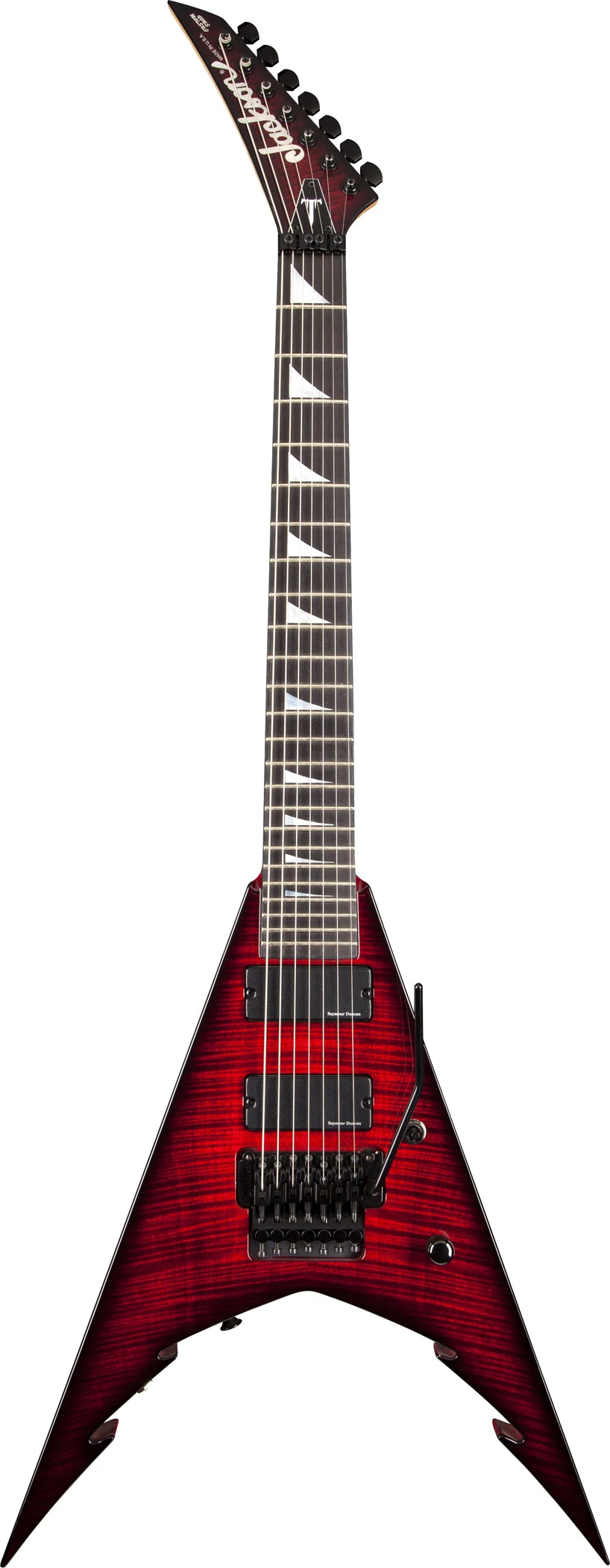 JACKSON KING V COREY BEAULIEU USA SIGNATURE KV7 TRANSPARENT RED - это семиструнная электрогитара, именная модель гитариста Corey Bealieu. Электрогитара имеет аутентичное роковое звучание, классический стиль деки и головы грифа гитар JACKSON. Электрогитара оборудована сквозным кленовым грифом радиального распила, накладка грифа из черного дерева (эбони). Маркеры ладов выполнены в виде треугольников. Инструмент пользуется популярностью среди гитаристов играющих рок и мелодичную инструментальную музыку. На деку установлен подвижный бридж с рычагом, модель Floyd Rose Original. Количество ладов грифа - 24 (Jumbo). Цвет гитары прозрачный красный, фурнитура черного цвета. Ширина верхнего порожка - 1,875" (47,6 мм.), мензура гитары составляет 25,5" (648 мм).