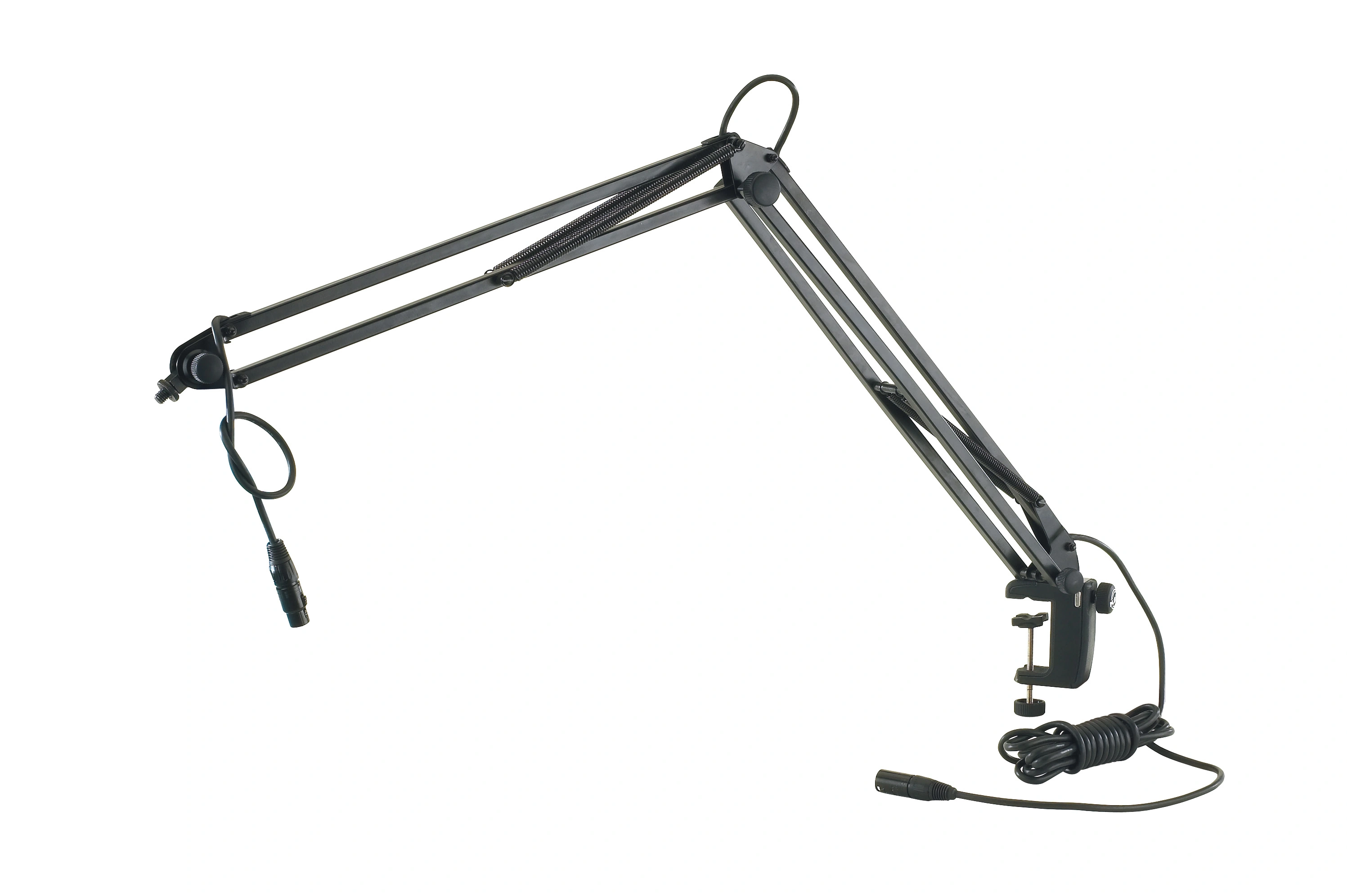 Стойка надёжно крепится к столешнице шириной до 48 мм при помощи струбцины. Оснащена микрофонным кабелем длиной 5 м со стандартными разъёмами XLR.