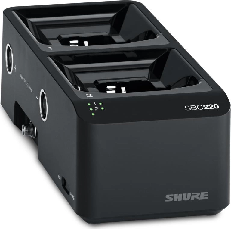 SHURE SBC220 — Двухсекционная зарядная док-станция для подзарядки беспроводных ручных микрофонов и звуковых передатчиков, а также аккумуляторов. Зарядное устройство совместимо с моделями беспроводных ручных микрофонов следующих моделей QLXD2, ULXD2 и AD2, а также с беспроводными передатчиками типа: QLXD1, ULXD1, AD1, P3RA, P9RA и P10R. Также можно заряжать одновременно два аккумулятора SB900/A.