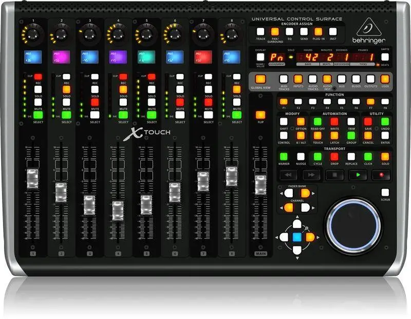 BEHRINGER X-TOUCH представляет собой универсальный MIDI-контроллер. Устройство предназначено для контроля и дистанционного управления DAW для концертных и студийных приложений. Контроллер оснащен 9 сенсорными моторизированными фейдерами, есть 8 динамических сенсорных ЖК-полос (LCD Scribble Strips), 92 кнопки с подсветкой, 8 энкодеров, 8-сегментных LED-индикаторов на каждом канале, выделенные элементы управления транспортом. Для коммутации с устройствами контроллер оснащен интерфейсом USB, MIDI и Ethernet-портом для подключения к компьютерной сети к Mac или ПК. Также реализована возможность использования ножных контроллер, для которых есть 2 специальных разъема.
