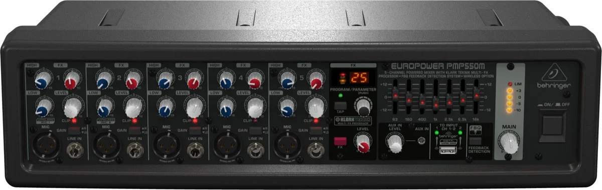 Пятиканальный микшер PMP550M снабжен пятью высококлассными микрофонными предусилителями (два из которых могут работать с беспроводной системой ULM Digital Wireless Microphones) и входом 1 / 8 \'\' Aux для проигрывания музыки с ваших внешних устройств. Для дополнительных профессиональных возможностей разработчики добавили процессор эффектов KLARK TEKNIK 24-bit Multi-FX с 25 эффектами студийного класса, включая реверберацию, дилэй, питч шифтер и многое другое. Кроме всего прочего вы получите отличный семиполосный эквалайзер с системой FBQ Feedback Detection System – для работы без негативных эффектов, влияющих на звук.
