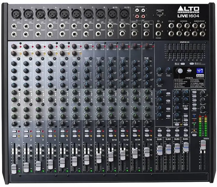 Традиционно пассивный аналоговый микшер Alto Live1604 сочетает в своей конструкции узнаваемые пользователями компоненты, предлагая все самое важное для работы со звуковым сигналом на концертах и музыкальных презентациях. Работа с микшером одинаково комфортна как пользователей начального уровня, так и для опытных звукорежиссеров. Микшер оборудован четырьмя AUX-шинами, имеет 4-ре подгруппы для посыла звукового сигнала, встроенный высококлассный процессор эффектов Alesis, USB-интерфейс для взаимодействия с ПК и встроенный блок питания.