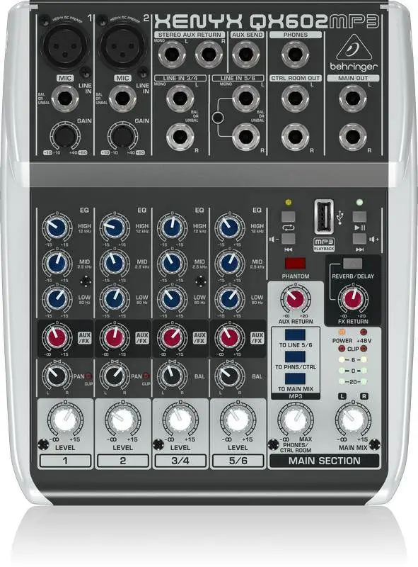 Behringer XENYX QX602MP3 - это компактный аналоговый микшер. Микшер имеет 6 каналов с разьемами XLR (2) и 1/4 Jack. Спецификация каналов следующая, это 2 микрофонных входа с разьемами XLR и 2 стереоканала (1/4 Jack). В стереоканалы можно подключать цифровые синтезаторы и фортепиано. Есть возможность подключения внешних устройств обработки звучания с независимой регулировкой уровня эффекта на каждом канале. Для подключения конденсаторных микрофонов микшер оснащен отключаемой системой фантомного питания. Для предусиления микрофонов используются оригинальные микрофонные предусилители XENYX. Корректировка и настройка звука осуществляется неоклассическими "британскими", трехполосными эквалайзерами, которые придают звучанию особую чистоту и прозрачность. Кроме всего, микшер оснащен MP3 проигрывателем с портом USB и процессором эффектов (Reverb, Delay). Компактный микшер Behringer XENYX QX602MP3 станет прекрасным приобретением для офисных презентаций, небольших выступлений музыкальных групп в торговых центрах и клубах, озвучивания выступлений передвижных театральных групп и прочих сфер, где важным частью является компактность и функциональные возможности.