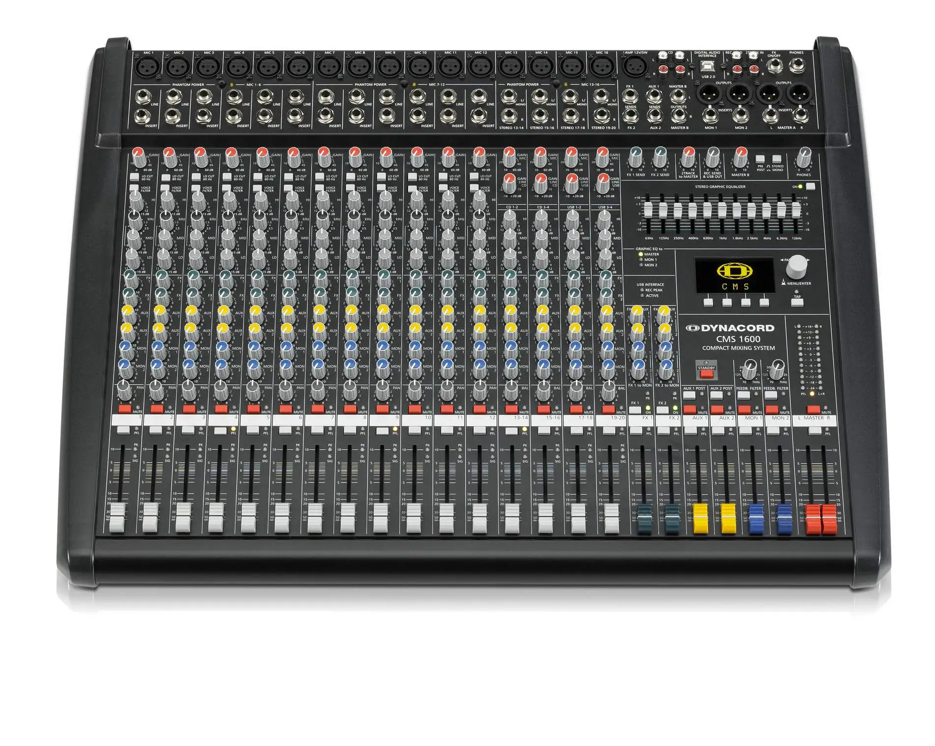 Dynacord CMS 1600-3 – 16-канальный микшерный пульт из последнего поколения линейки CMS Compact Mixing System. Это многофункциональный микшер, обладающий широкими функциональными возможностями и великолепным качеством звука. В конструкции применяются комплектующие самого высокого качества, в том числе фейдеры и потенциометры Alps. Модель оснащена 12 микрофонными/линейными моно каналами и 4 стерео каналами. CMS 1600-3 оснащён двумя встроенными процессорами эффектов со 100 пресетами и 20 пользовательскими банками для собственных установок в каждом. Он имеет удобный и интуитивно понятный пользовательский интерфейс. В мастер-секции имеется 11-полосный графический эквалайзер. На экране высокой контрастности, отлично читаемом даже при ярком освещении, наглядно отображаются настройки. Имеются интерфейсы MIDI и USB 2.0 для подключения к компьютеру. Dynacord CMS 1600-3 легко транспортировать и устанавливать. Вес микшера – 12 кг. Блок питания с автоматическим переключением вольтажа позволяет использовать микшер в любой стране мира.
