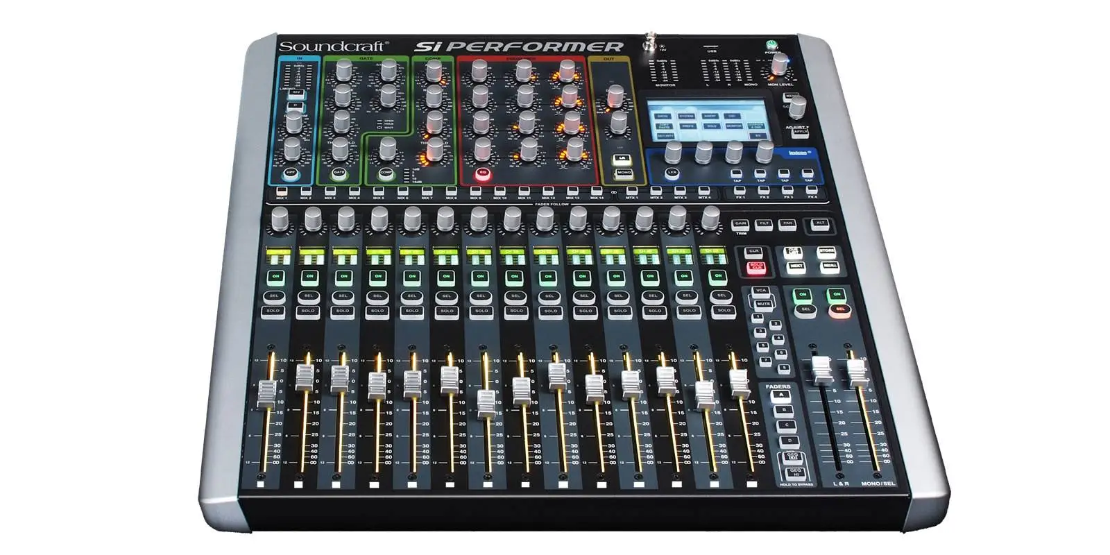 Soundcraft Si Performer 1 – компактный цифровой микшерный пульт от знаменитого английского производителя. Благодаря своим размерам эта модель может использоваться не только в фиксированных инсталляциях в концертных залах, клубах или театрах, но также в турах и на различных выездных мероприятиях. Si Performer 1 отличается удобным и интуитивно понятным управлением. В этой компактной модели предусмотрено 448 различных вариантов обработок DSP. Имеется 16 микрофонных преампов, 8 линейных входов, четырехполосный полнопараметрический эквалайзер на всех входных каналов. Особенность данной модели – это возможность управления не только звуком, но также и светом. Настройки DMX можно сохранить также как и настройки звука и затем оперативно вызвать их одним касанием. Предусмотрено два слота расширения для опциональных карт ViSi Connect Expansion, что дополнительно увеличивает функциональность модели.