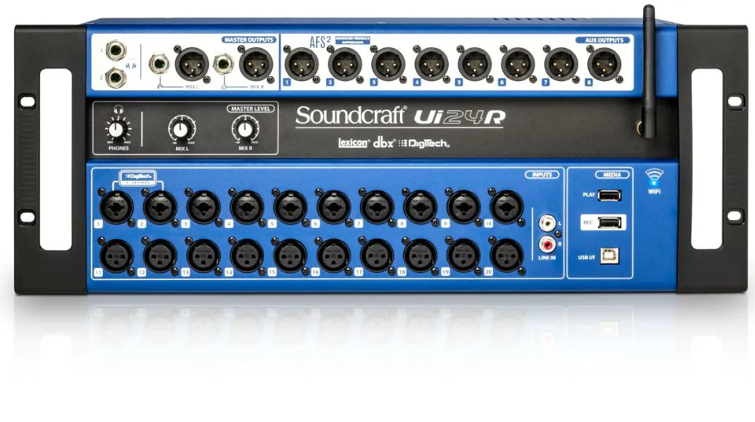 Soundcraft Ui24R – многофункциональный высокопроизводительный микшер из серии Ui, представленный Soundcraft на выставке NAMM зимой 2017 года. Это флагманская двадцатичетырёхканальная модель линейки, обладающая самым широким функционалом. Имеется 22 аналоговых входа и 2 цифровых. В конструкции используются высококачественные микрофонные предусилители Studer. Модель прекрасно подойдёт как для концертных площадок, так и для применения в студии. Особенность этого микшера, как и всех моделей линейки, - это удобство удалённого управления через Wi-Fi подключение с любого мобильного устройства. Кроме того, удалённо управлять микшером можно также с компьютера или ноутбука, используя стандартное сетевое подключение Ethernet. Можно управлять микшером с нескольких устройств, до десяти одновременно. Наличие порта USB позволяет записывать материал на флешку или передавать сразу в приложение для работы со звуком. Soundcraft Ui24R полностью совместим с Harman Connected PA. Модель заключена в прочный корпус, устанавливается в рэк, занимая по высоте 4 секции.