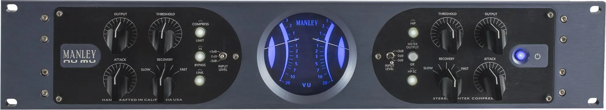 MANLEY NU MU Stereo Limiter Compressor – современный профессиональный стерео лимитер компрессор, использующий ламповую технологию T-Bar, аналогично легендарному Variable Mu®. В конструкции применяется 4 подобранных вручную лампы 6BA6. Обработка NU MU обеспечивает прекрасное звучание благодаря ряду передовых технологий. Трансформаторы Manley IRON® на входах позволяют получить чрезвычайно ровную частотную характеристику. Функция HIP позволяет улучшить динамику тихого звука без ущерба для более громких участков. Динамический диапазон – 112 дБ. Элементы управления включают регулятор выходного сигнала, регуляторы Threshold, Attack и Recovery отдельно для левого и правого каналов. Переключатель компрессор/лимитер позволяет использовать два коэффициента сжатия. Встроенный универсальный блок питания 90-254 В был специально разработан для использования с ламповой схемой и обеспечивает стабильную работу в любых условиях. NU MU заключен в прочный металлический корпус, устанавливается в рэк, занимая две секции по высоте.